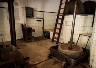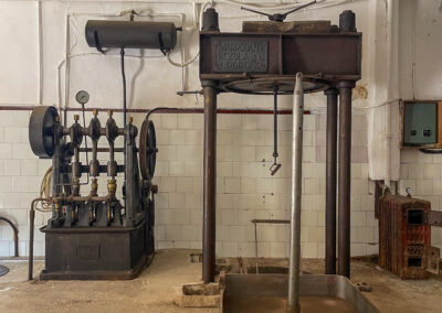 L’interior conserva bona part de la seua maquinària, en la planta baixa se situa tot el procés d’extracció de l’oli, amb el queixal cilíndric amb doble pedra cilíndrica de granit, la premsa de fosa i els diversos depòsits de decantació. A més, conté els raïls de les vagonetes i la rotonda de gir d’estes. L’edifici es completa amb una habitació utilitzada com a despatx i un espai diàfan en la segona planta que seria utilitzat com a espai de magatzematge.