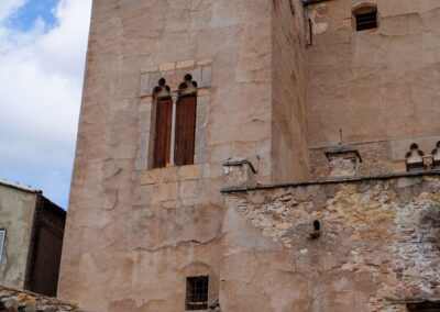 L’edifici es compon d’un semisoterrani —amb una gran profusió d’arcs— i tres plantes. L’accés es realitza per una porta amb arc de mig punt format per àmplies dovelles, i sobre ella s’obrin les dues úniques finestres de la planta baixa. Per damunt hi ha un primer cos amb merlets i, sobre aquest, enretirada, la planta noble, tal com testimonien les riques finestres ogivals. Les torres, de planta quadrada i amb merlets, s’alcen sobre el conjunt, encara que han estat unides per un últim cos de construcció posterior, o si més no profundament modificat.