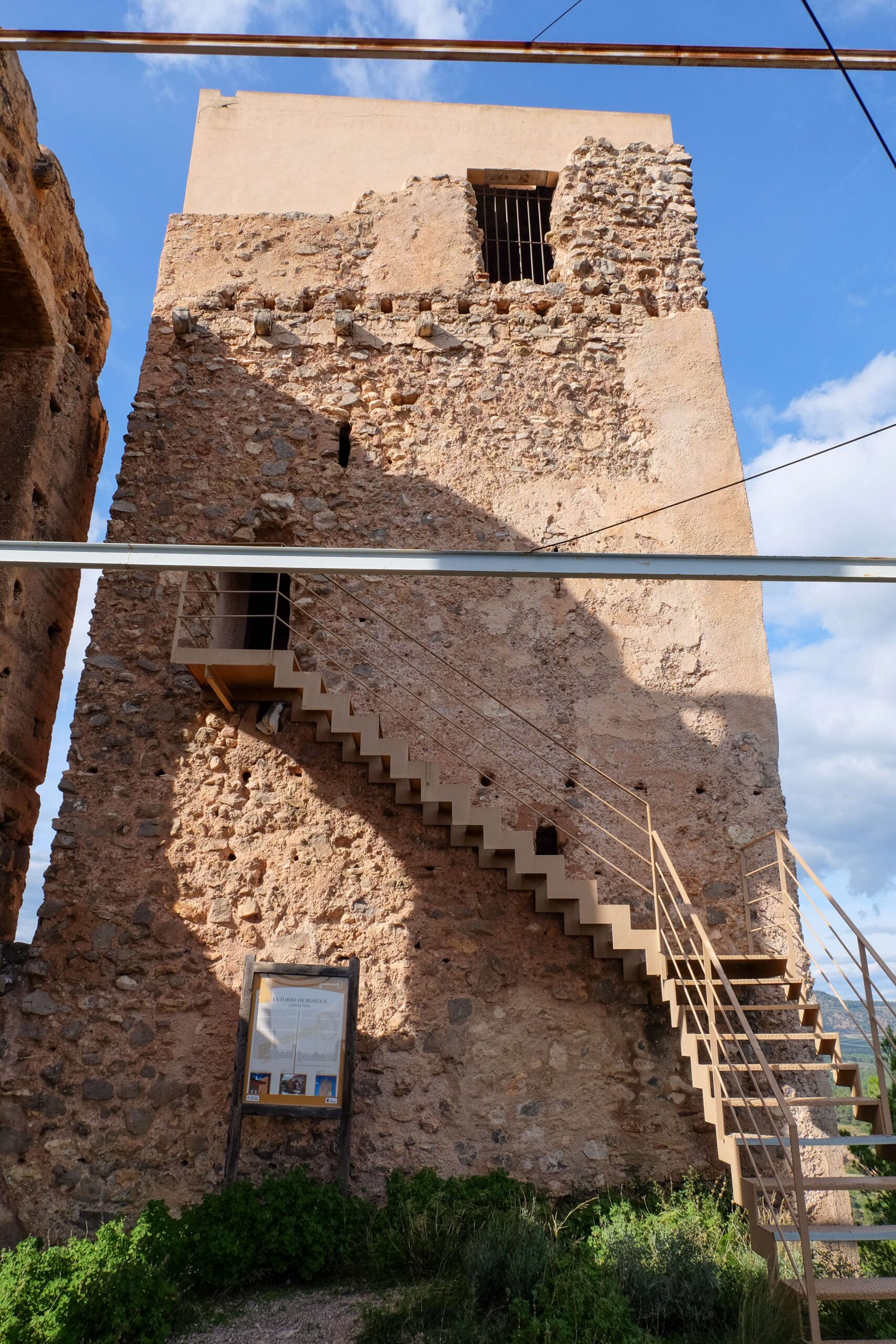 La construcció és de tàpia, amb abundants agulles i espitlleres als murs exteriors. L’escala i els arcs de sustentació interiors són de pedra tallada. Està formada per quatre murs perimetrals i un de central, que donava pas a dos espais coberts amb voltes de canó. L’escala de dos trams presenta escalons de pedra de Sagunt. El nivell inferior de la torre sembla que tenia una cisterna que recollia aigua de pluja, posteriorment refeta en època cristiana. El nivell intermedi era on feien vida els ocupants, i el superior tenia funció de vigilància amb obertures defensives a les quatre cares.