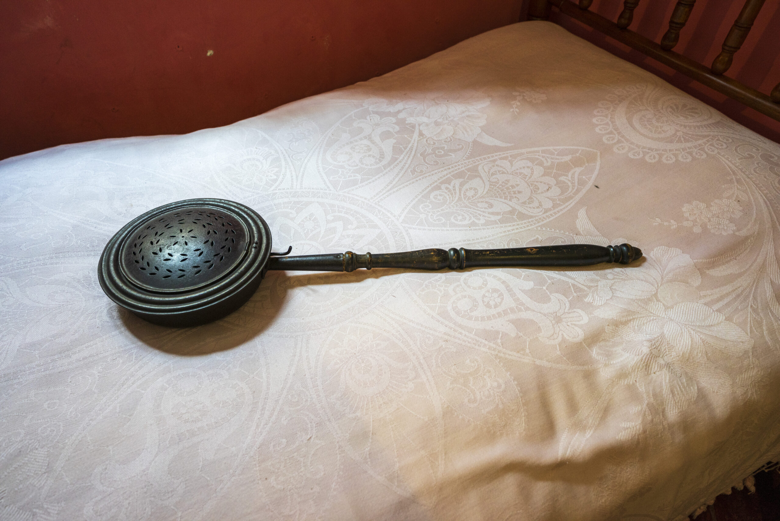 Exposat sobre el llit trobem el calfallits, que és un recipient de ferro amb mànec de fusta per a calfar el llit abans de ficar-se al llit. Quan s’havia apagat el foc de la ximenera, les brases calentes de la ximenera s’introduïen davall de la tapa del calfallits i es passava aquest per l’espai entre el matalàs i els llençols i això proporcionava calor al llit.