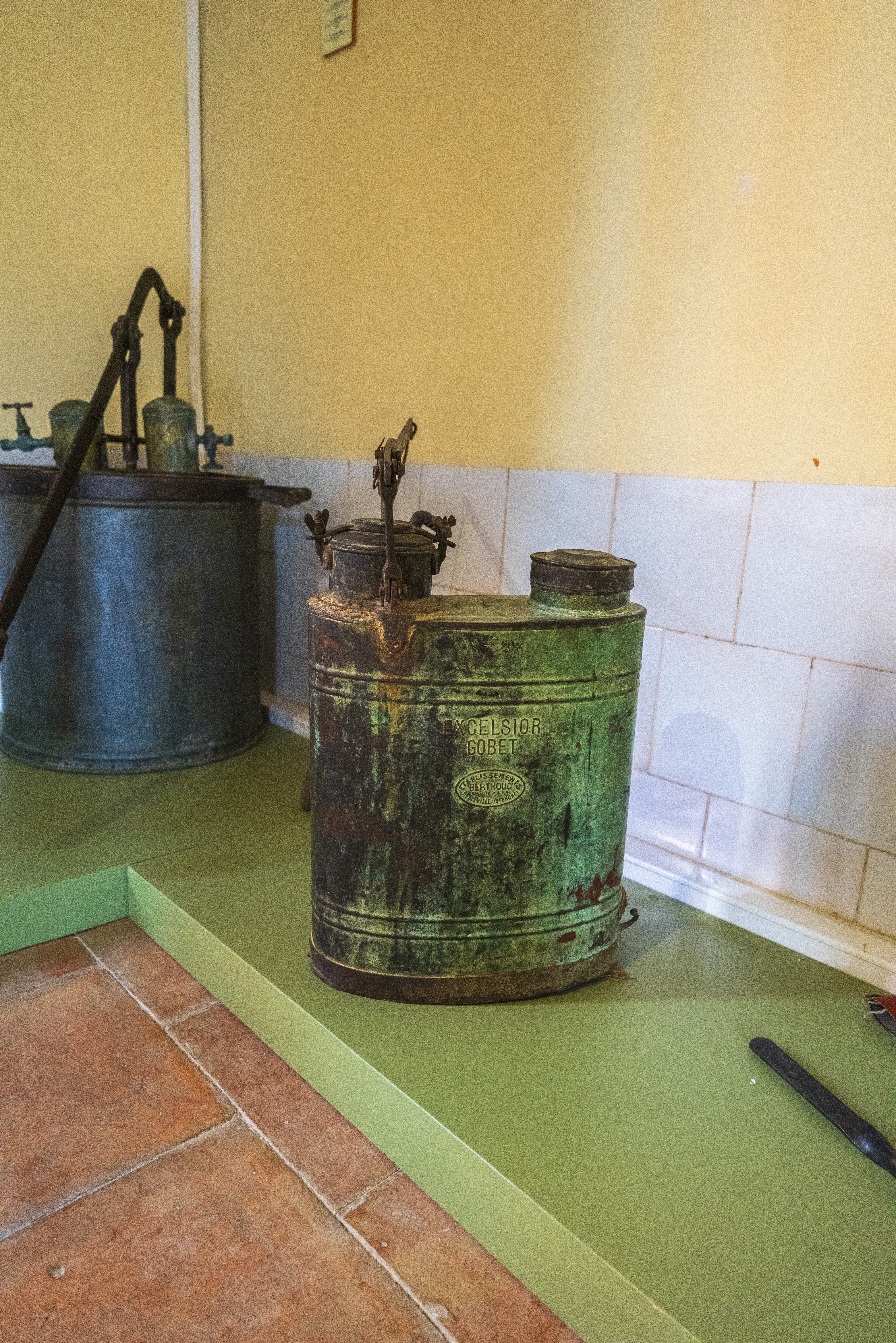 MÃ quina de sulfatar manual de motxilla marca Berthoud, fabricada en coure, empleada per al control de plagues que perjudiquen el seu creixement.