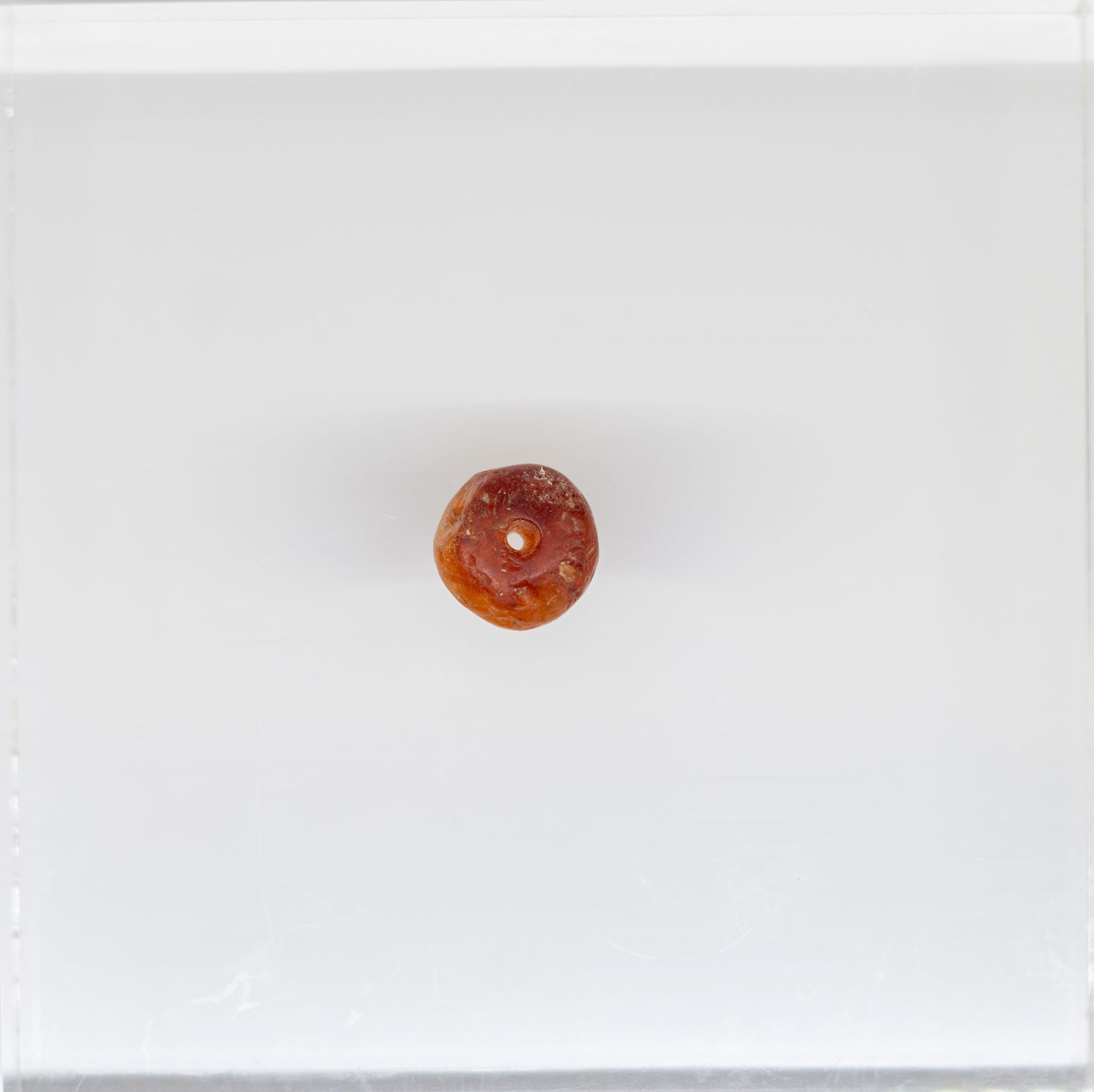 Descripció: Bola de collar realitzada amb pasta vidriada. Mostra un orifici a la part central on s’allotjava el fil del collar.