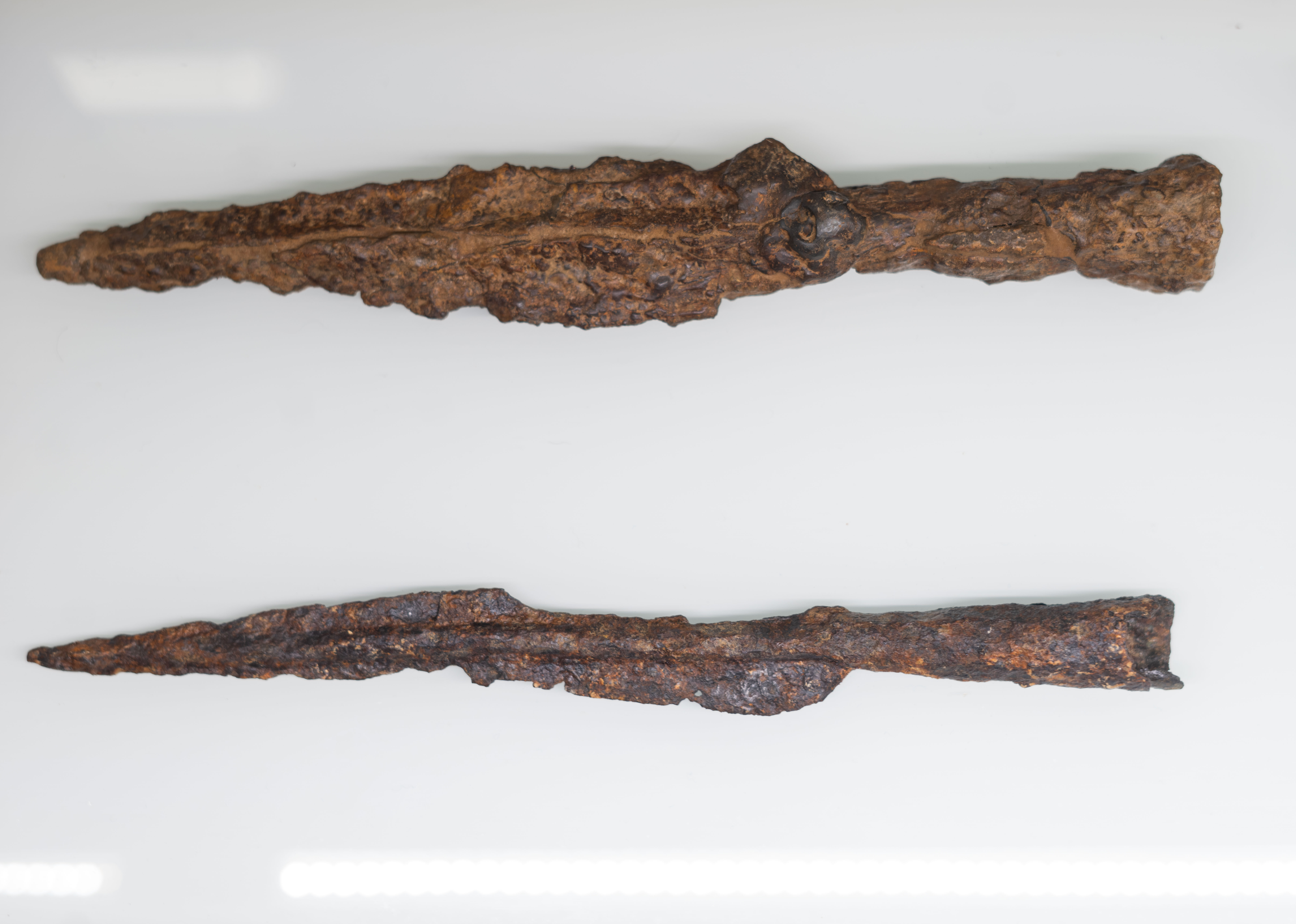 Descripció: Punta de llança, també denominada com ‘pilum’, realitzada en ferro. Mostra una forma piramidal apuntada. Formava part de l’equip bàsic d’un legionari, amb el casc, l’escut i l’espasa. En la meitat de la llança solia posar-se un cordó que servia per imprimir més força en el llançament. Com a curiositat, podem veure que conté elements naturals, com pedres adherides.