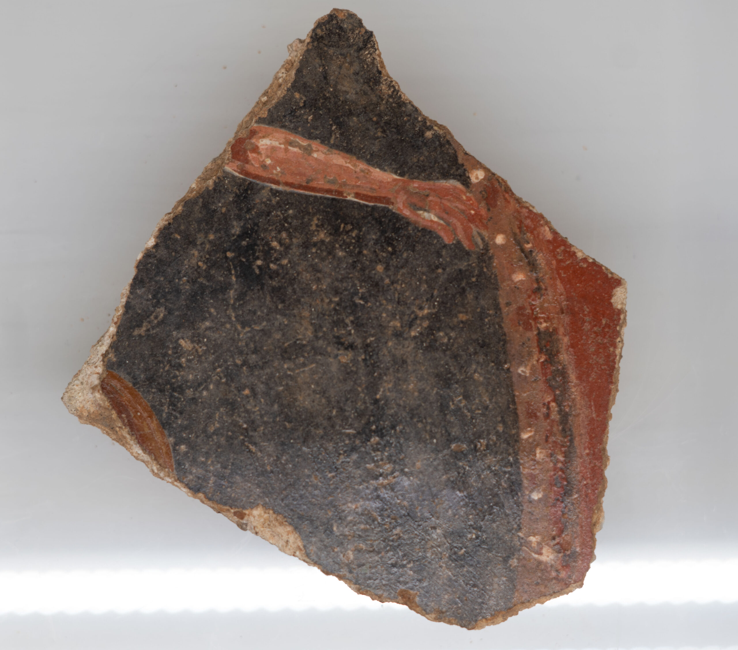 Descripció: Fragment de pintura mural realitzat a partir d’estucat pintat al fresc. Presenta sobre un fons negre un braç de colo rogenc que podem deduir d’un cos de forma humana. Pareix que sosté alguna cosa, la qual no es pot identificar pel petit fragment conservat. És una pintura mural que pertany a una de les habitacions d’una vila romana de Silla.