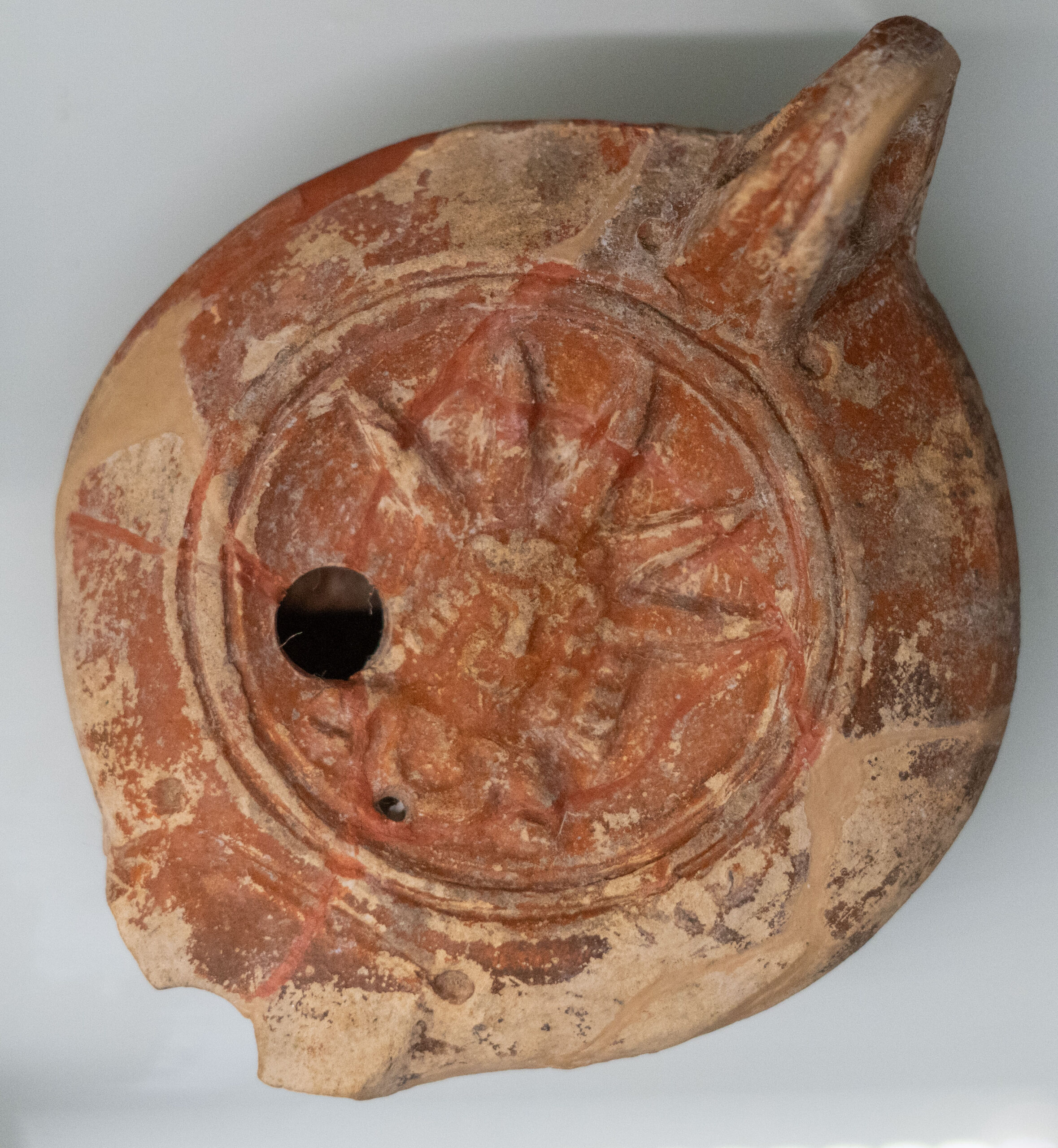 Descripció: El disc superior es troba decorat amb el bust del Déu Heli amb la corona de raigs de sol. En la base apareix la marca estampillada LFABRICMAS amb contramarques en forma de ferradura que indiquen la tria nòmina del fabricant: Lucius Fabricius Masculi. Aquest dibuix va inspirar el logotip de la primera Col·lecció Museogràfica.