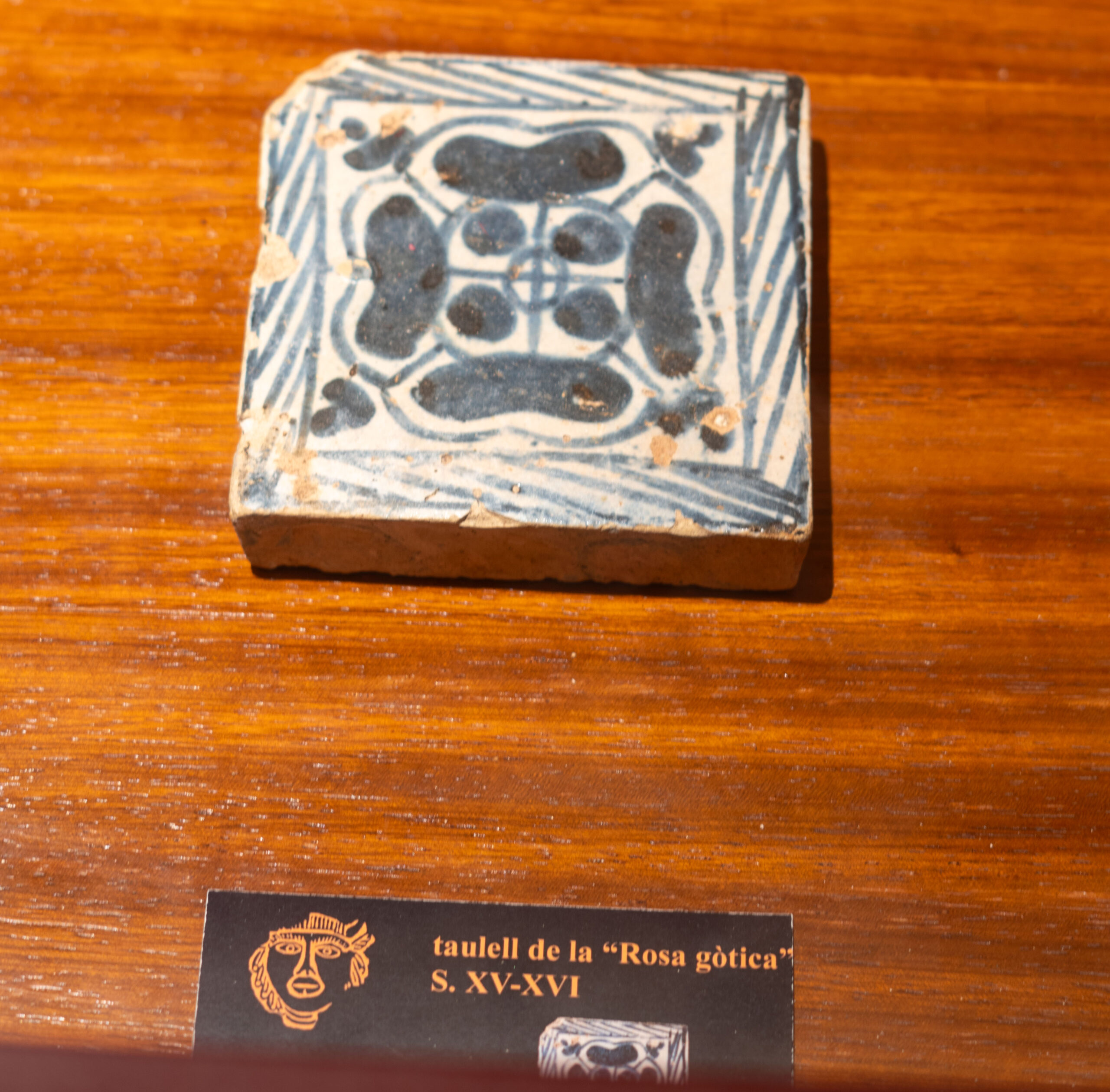 Descripció: Decoració pictòrica naturalista, coneguda com a “rosa gòtica”, de blau cobalt sobre coberta estannífera formada per quatre pètals emmarcats. Amb el temps s’anirà esquematitzant i reduint de mesura.