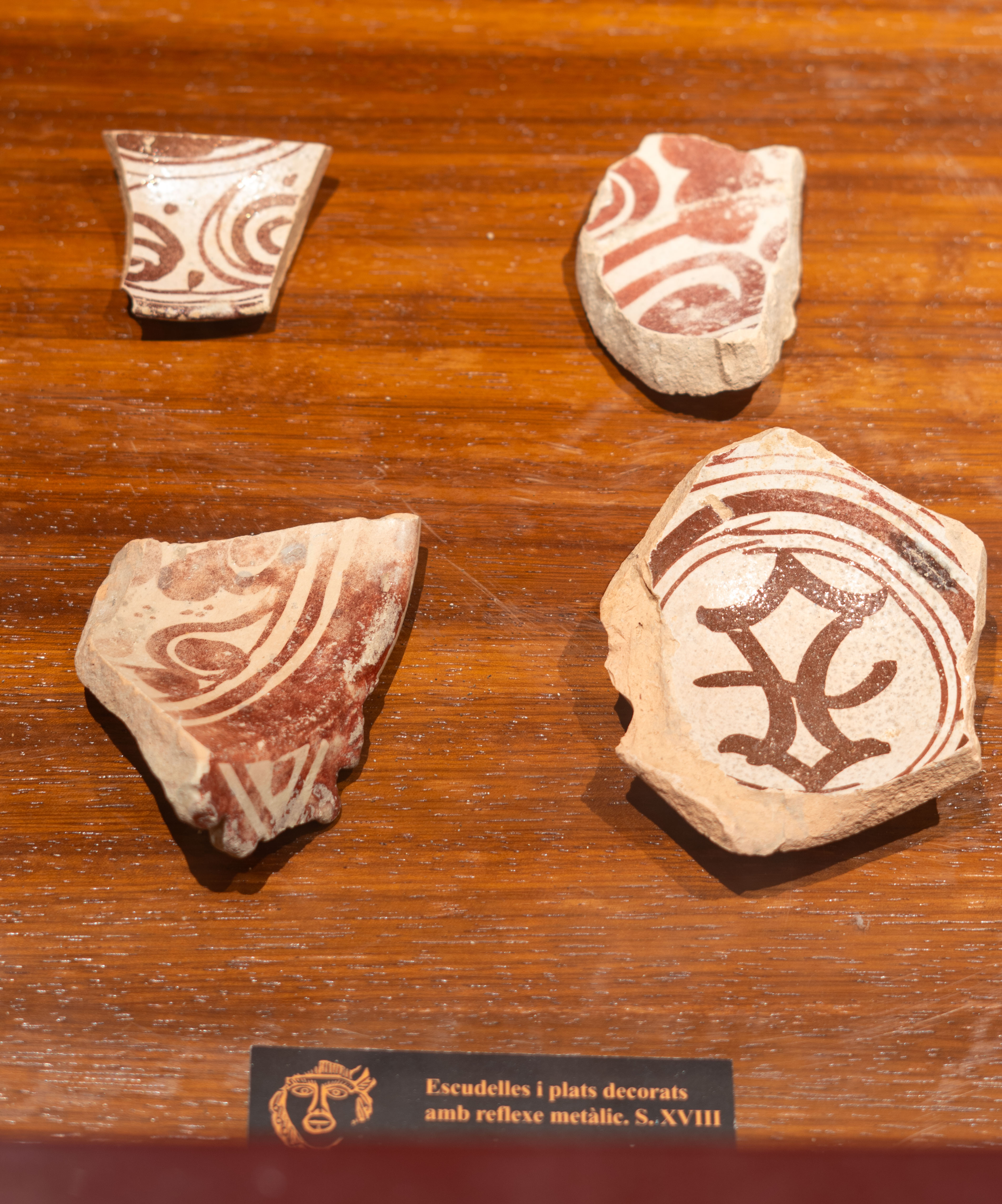 Descripció: Fragment de ceràmica que prové de la base del que es pensa que va ser una tasa. En una base color os, sobre aquesta, es decora a partir de traçats geomètrics color marró. Per la capa vidrada, emet uns reflexos metàl·lics.