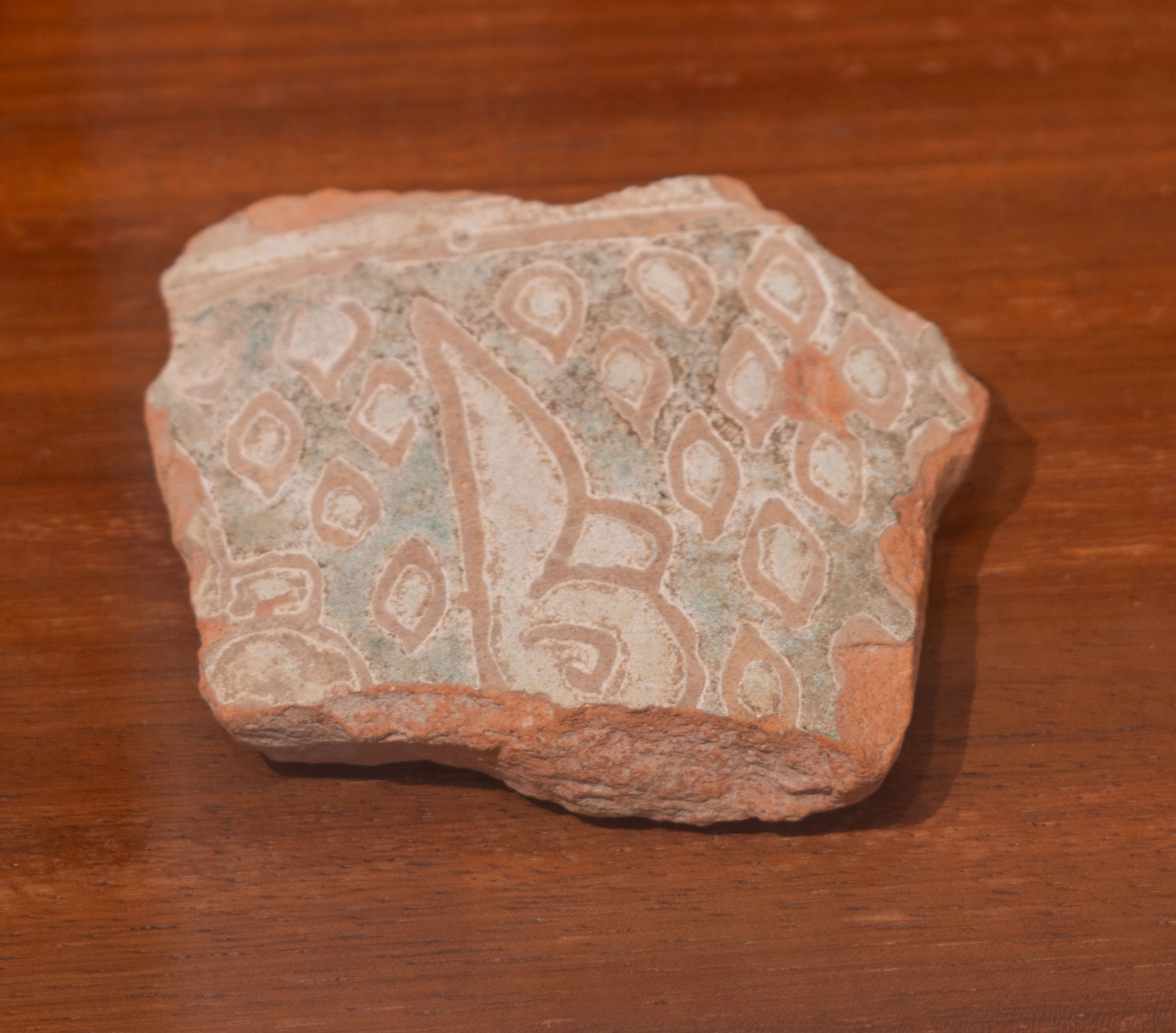 Descripció: Fragment de ceràmica decorada amb corda seca. Mostra un motiu epigràfic amb llengües de tonalitat verda.