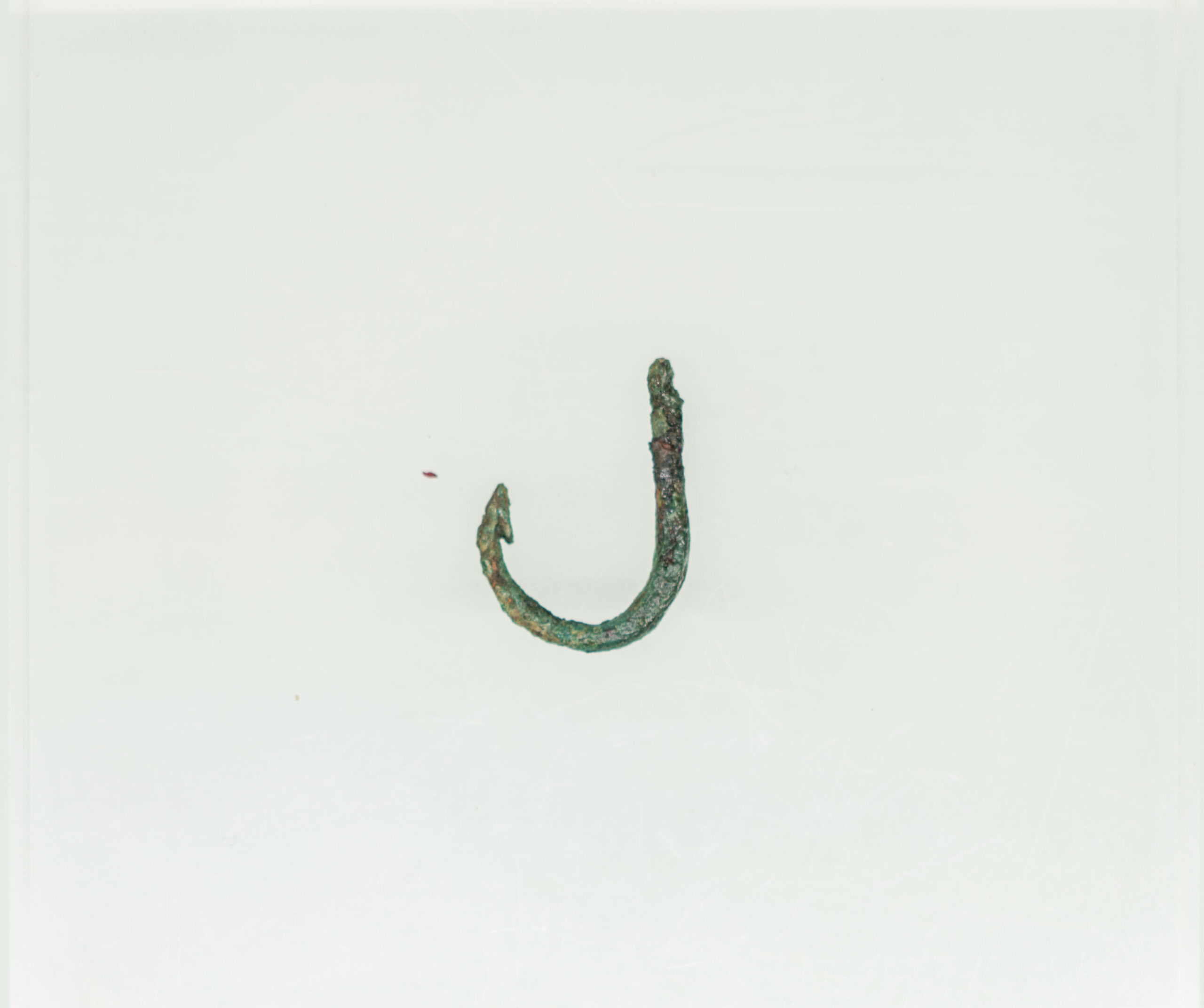 Descripció: Hamet de bronze que conserva en bon estat la seua forma original. Eina emprada per pescar.