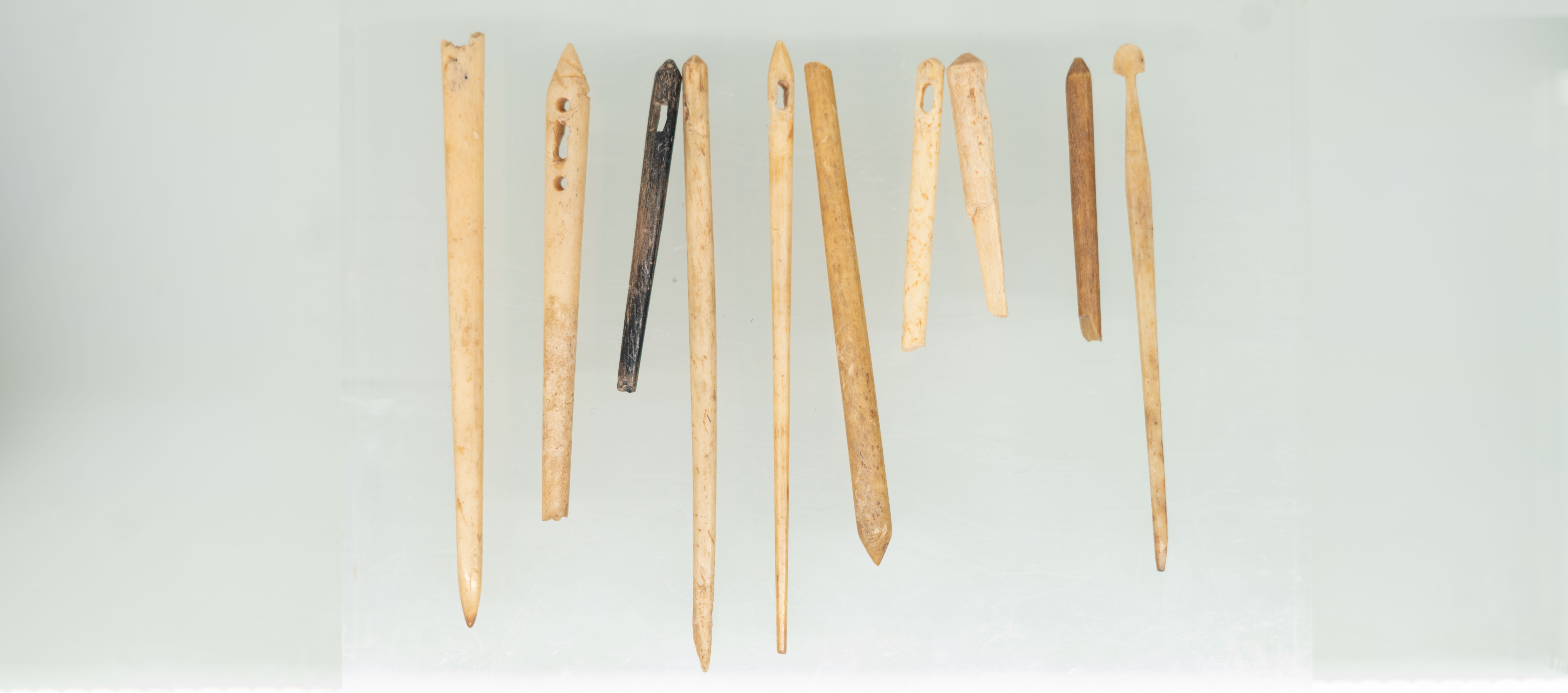 Descripció: Hi ha dos senceres i sis fragments. Mostren forma apuntada amb un orifici a la part superior. Eren agulles de os que servien per subjectar el pèl i ‘estilus’ per a escriure. També tenien com a funció la confecció de teles de diferents materials ja siga lli o llana. Es registren nombroses agulles d’os de diferents mesures. Les perforades servien per a cosir i les altres, que tenen un acabat d’esfera, forma cúbica o polièdrica, eren més comunament per decorar o arreplegar el pèl.