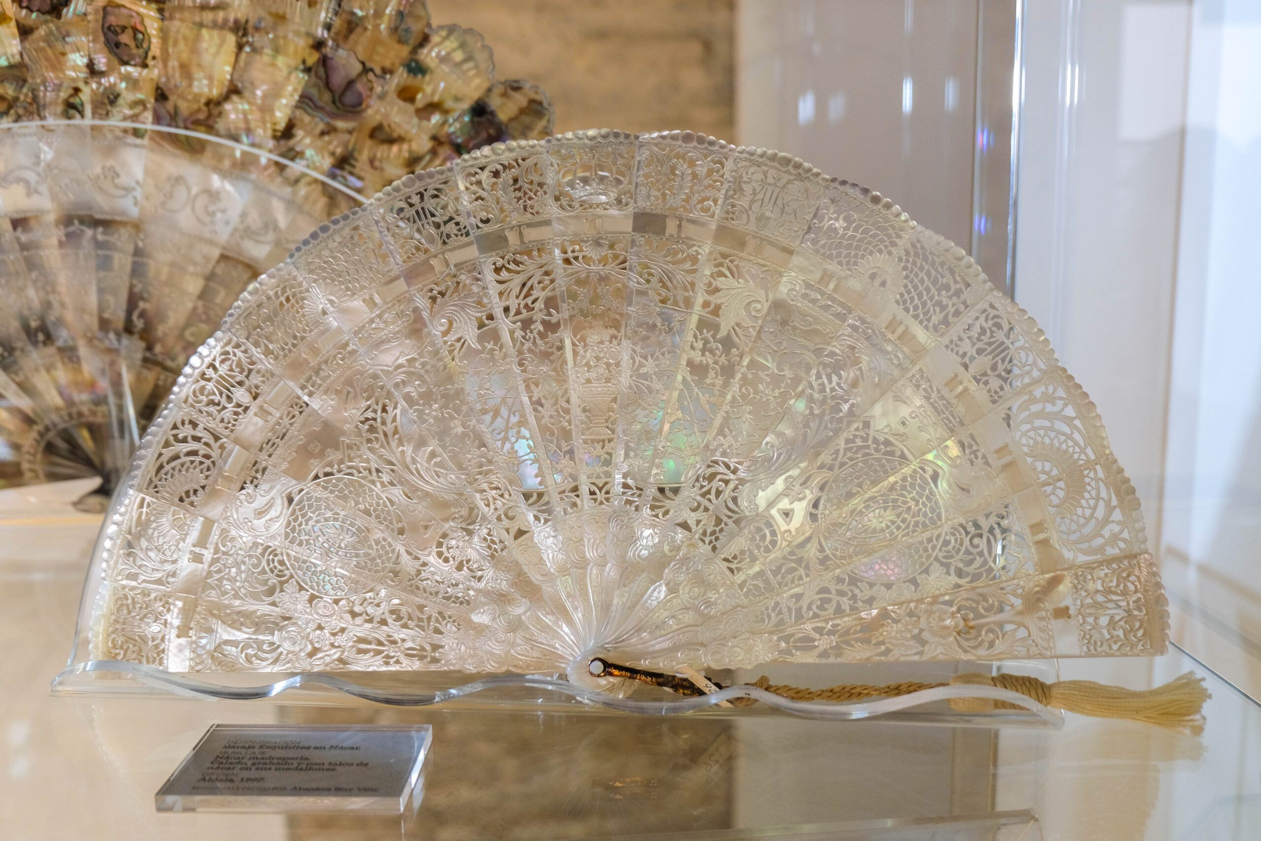 Varillaje: Nacre nacre madreperla blanc. Calat, gravat i amb talc de nacre en els seus medallons (15+2)
