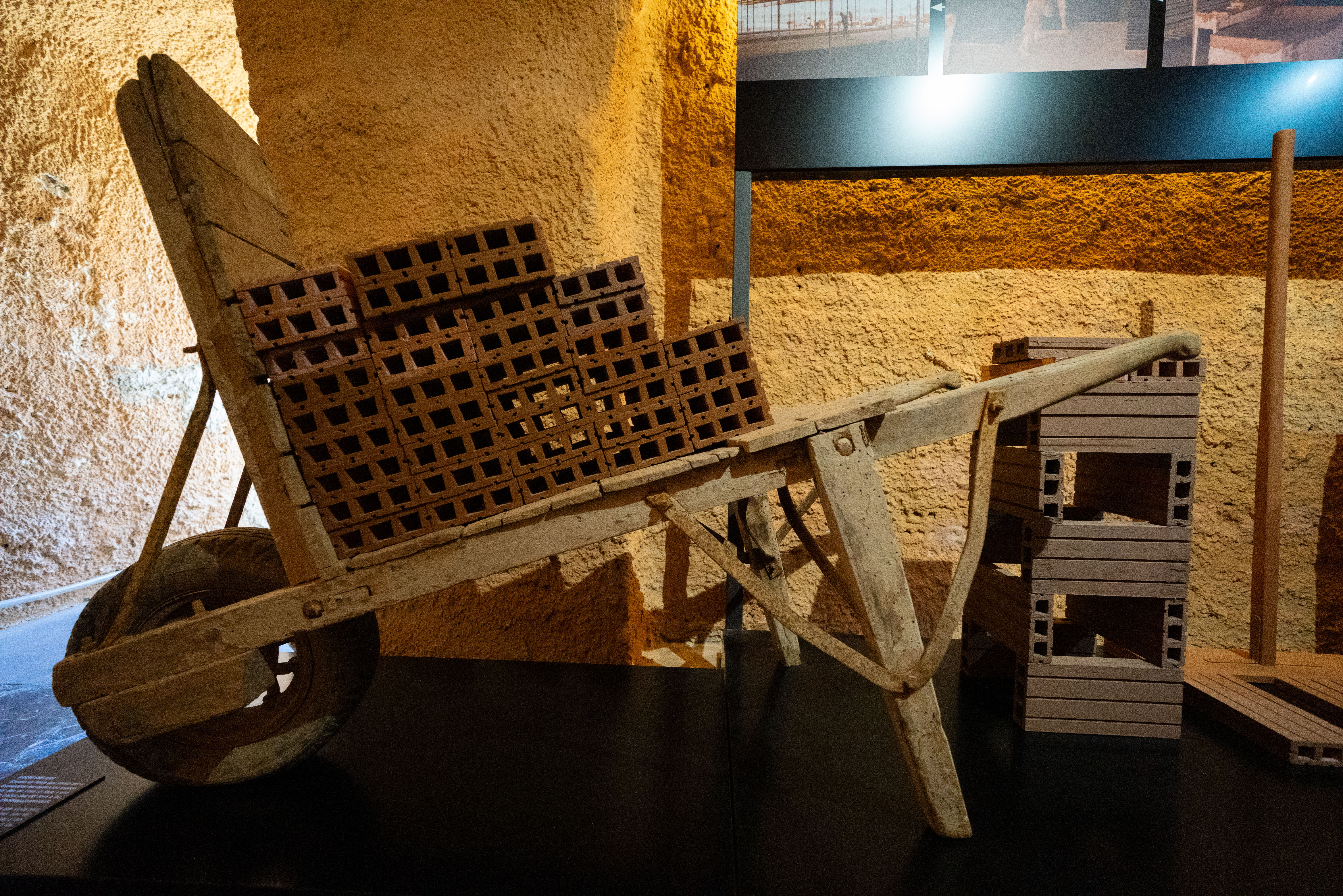 Descripció: Carreta de fusta que servia per a transportar les rajoles una vegada fetes des de l’era al forn; i una vegada cuites des del forn a les barraques d’emmagatzemament