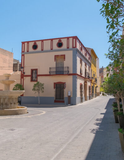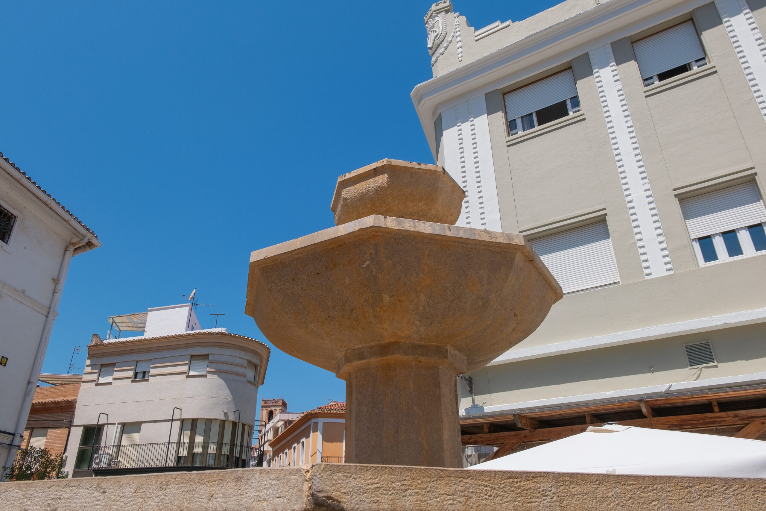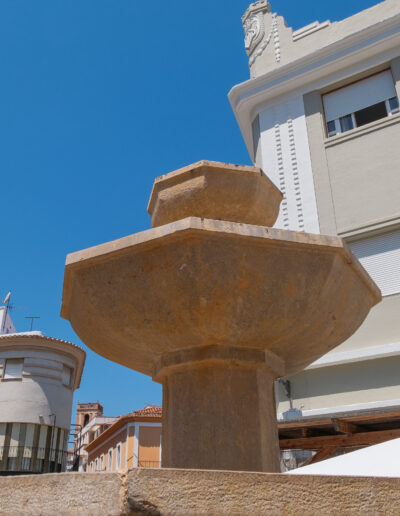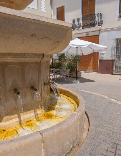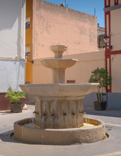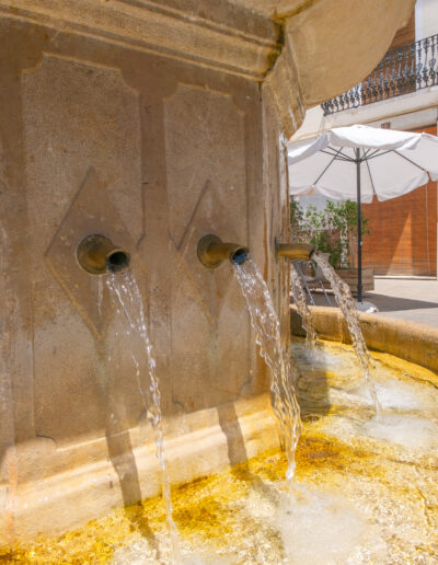 Built in 1913, after a few years a sort of column was added to the fountain, topped by a statue representing the symbol of justice. However, this statue was demolished in 1931 during the Second Republic. The new ‘Fuente de los 16 Chorros’ (Fountain of the 16 Jets) was inaugurated during the patron saint festivities in October 1951. It was raised so that it was at the same level as the square, thus eliminating the steps that previously had to be lowered to access it. In addition, decorative panels were added, and it is still preserved in this way today.
