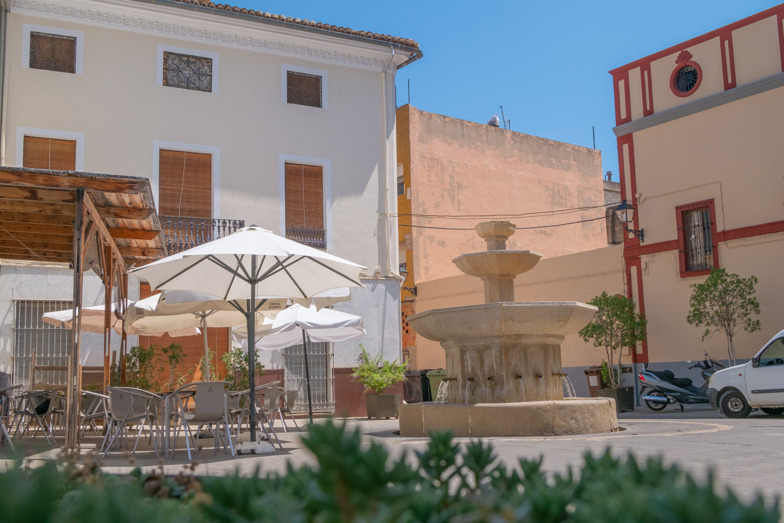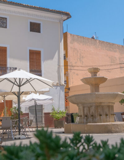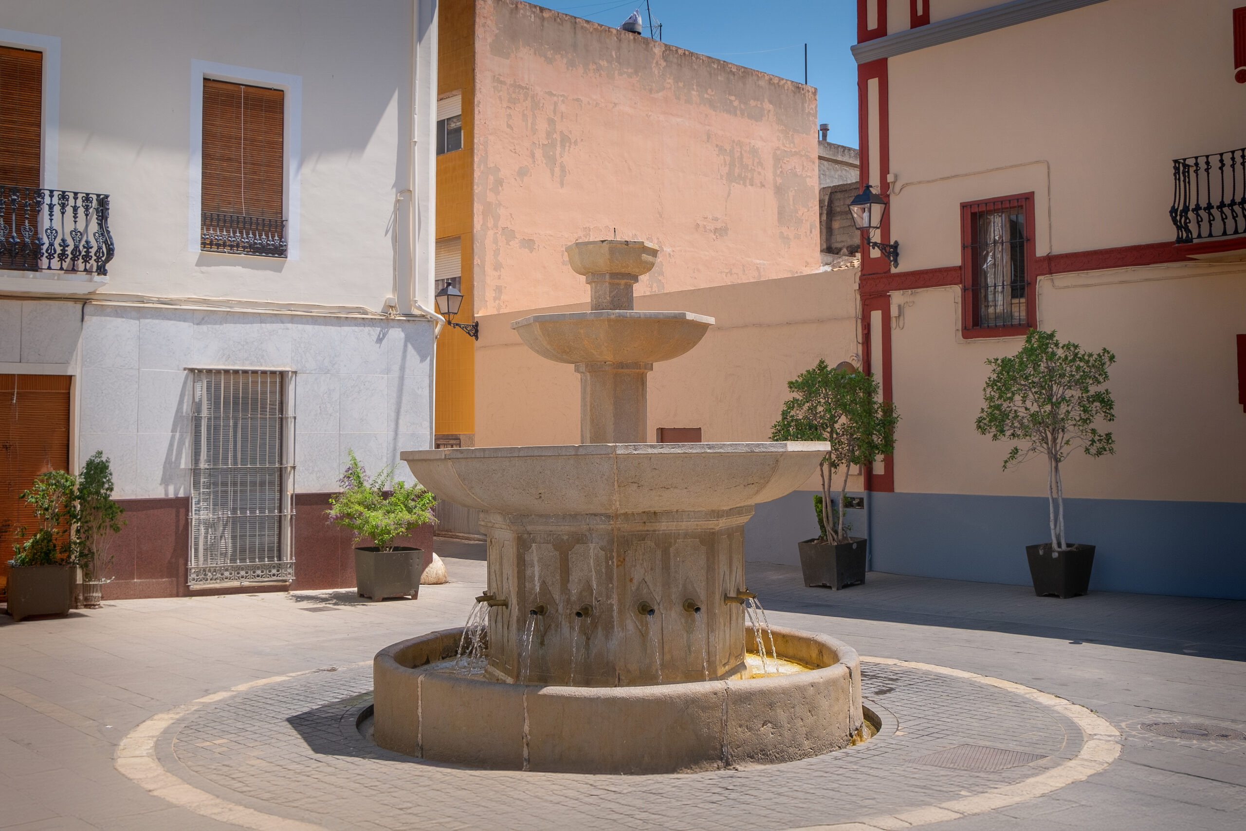 The fountain is closely linked to its patron saint, the Virgen de la Fuente. According to tradition, in 1708 a woodcutter and fisherman named Senent Pla found a small wooden box floating downstream in the town’s river, the river Serpis. Inside the box was a carved wooden figure of a virgin. This image was used to take to the sick, and with her prayers, cures were produced. In 1712, a severe drought hit the town, endangering crops and livestock. At that time, the town’s parish priest decided to place the image of the Virgin in the fountain of the spring, and shortly afterwards the water began to flow again.