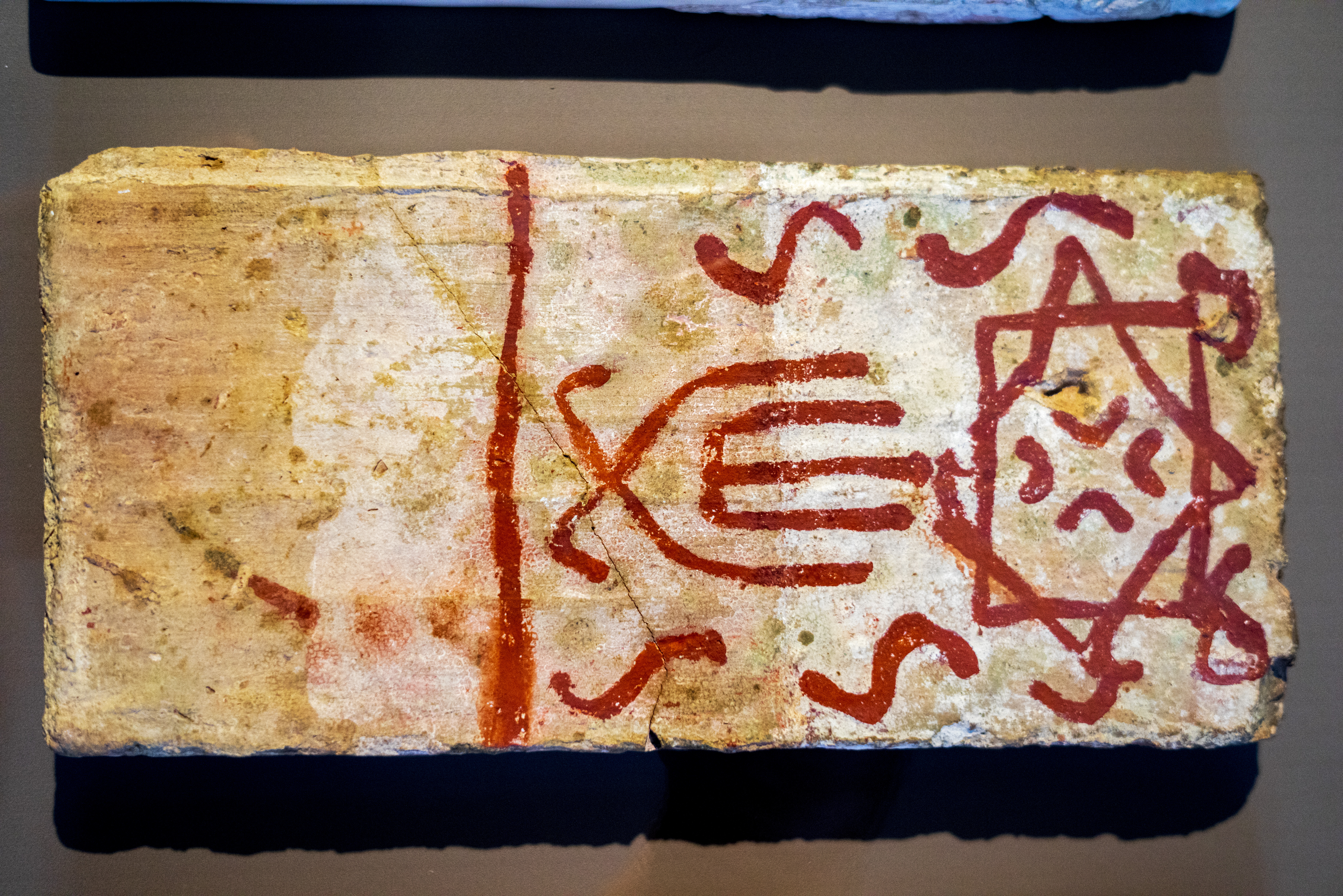 Socarrat de alero procedente de la ermita de Santa Anna de Simat de la Valldigna, antigua mezquita de la Xara. Su decoración al almagre se limita a una parte de la pieza al quedar la otra inserta en la fábrica de la cornisa.