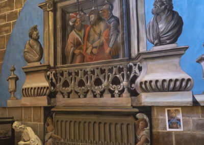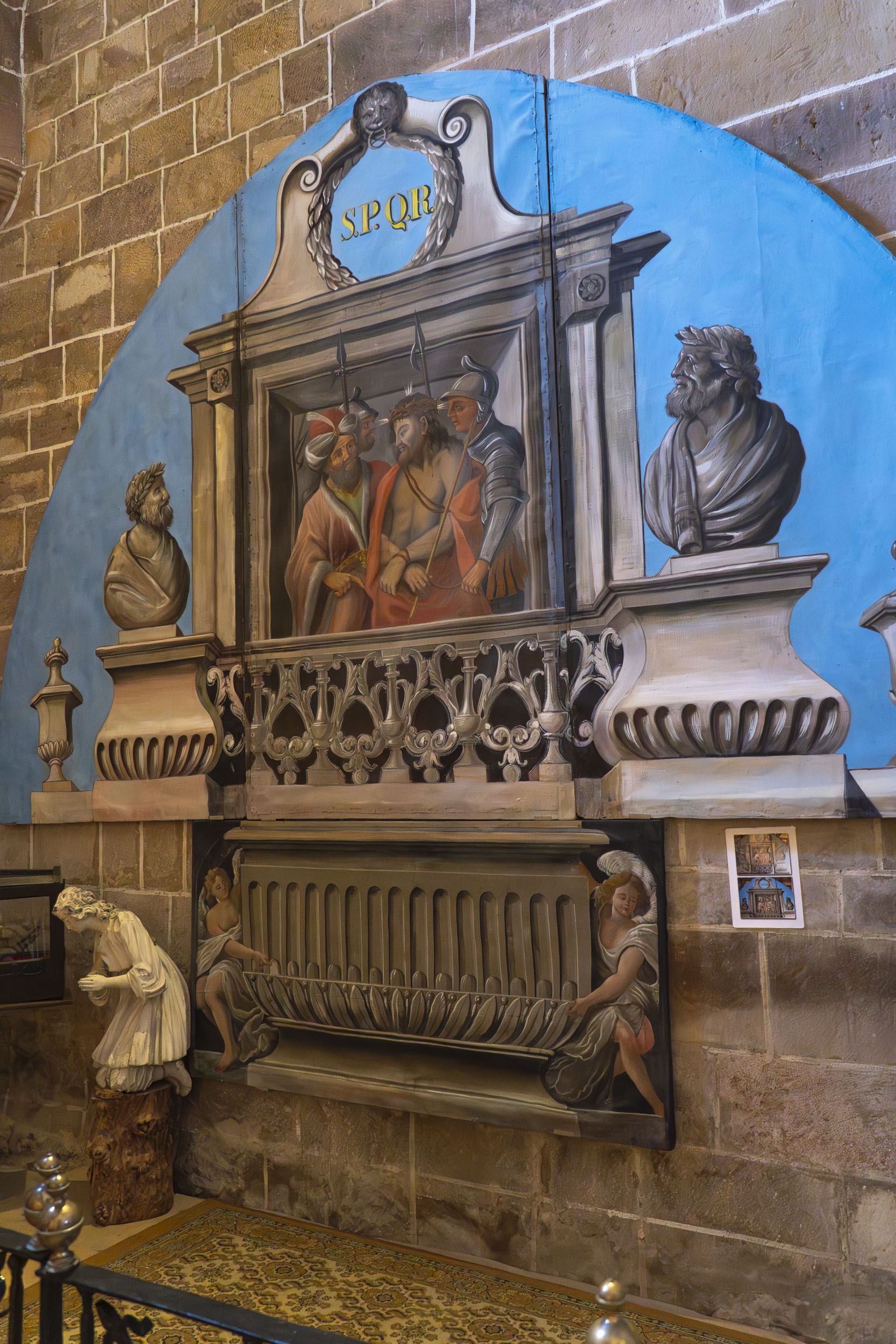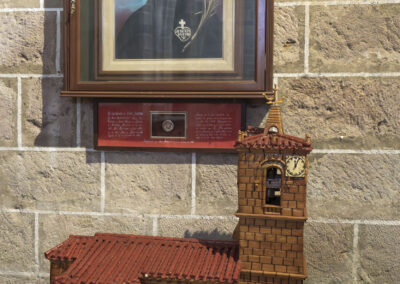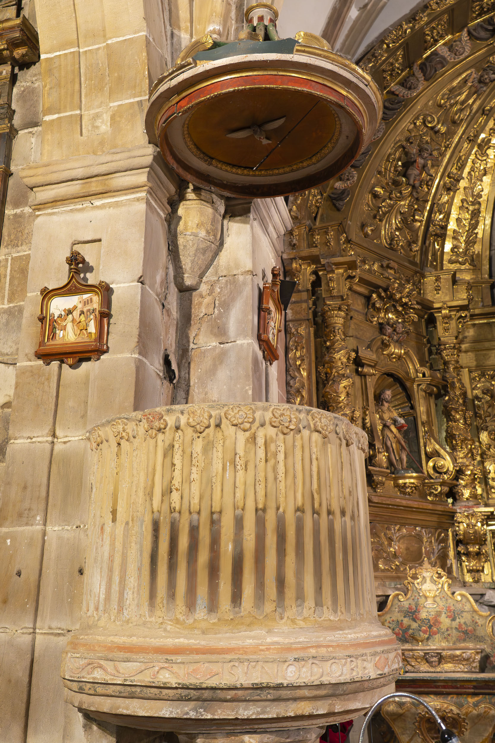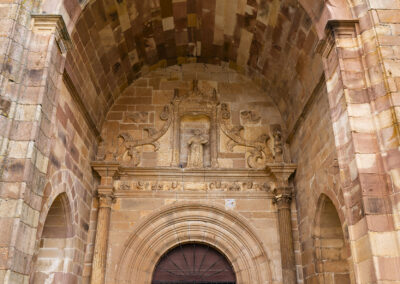 A los pies del templo se levanta una torre de cuatro cuerpos, horadado por arcos de medio punto el cuerpo inferior, lo que la convierte en una torre-pórtico, con fachada renacentista, adornada con una hornacina donde se aloja la estatua de San Pelayo.